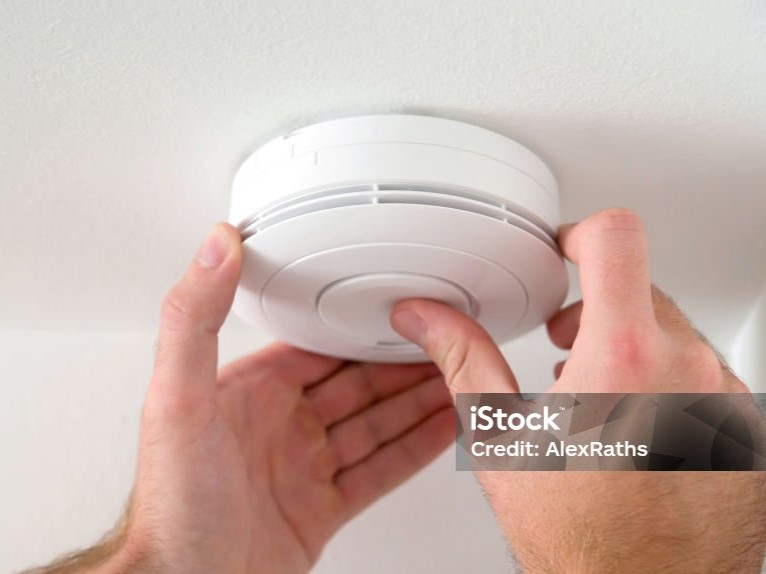Required on every floor and bedroom. Test monthly and replace batteries twice a year.